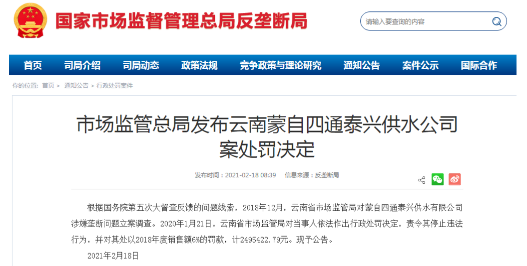 根據(jù)國務(wù)院第五次大督查反饋的問題線索,2018年12月,云南省市場監(jiān)管局對蒙自四通泰興供水有限公司涉嫌壟斷問題立案調(diào)查。2020年1月21日,云南省市場監(jiān)管局對當(dāng)事人依法作出行政處罰決定,責(zé)令其停止違法行為,并對其處以2018年度銷售額6%的罰款,計2495422.79元。