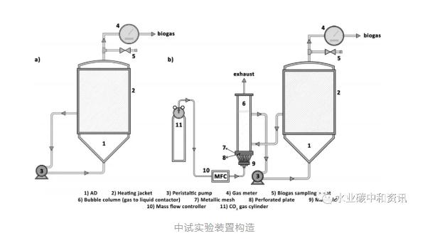 眾所周知,co2是在消化過程中伴隨著甲烷產(chǎn)生的產(chǎn)物。而另一方面,利用厭氧消化進(jìn)行co2捕集固定是一種潛力十足的碳減排策略。兩個處理食品垃圾的厭氧消化試驗進(jìn)行了225 d監(jiān)測,實驗組定期使用氣泡柱充入co2(fernandez et al.)。實驗組測試ch4產(chǎn)率為0.56±0.13 m3ch4/kgvs·d(對照組為0.45±0.05 )沼氣中ch4濃度為68%,額外攝取了外源co20.55 kg,h2濃度增加了2.5 倍,這歸因于co2溶解以及酸化與產(chǎn)氫途徑改變。
