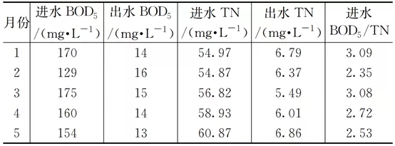 然而在實際運行過程中,受回流液中do濃度的影響,反硝化效率很難達到理論值。如表2所示,再生水廠2021年1月至5月進水bod5/tn的平均值為2.75,低于2.86的理論值。日常該水廠生物池內回流比為350%左右,按照式(2)計算理想狀態下的脫氮效率為78%,在未投加外加碳源的情況下生物系統實際反硝化脫氮效率為77%(見表3)。考慮剩余污泥排放中攜帶的氮含量,進水總氮平均去除率為89%。
