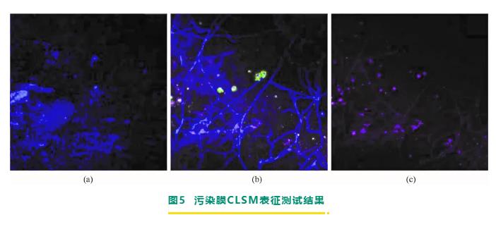 膜污染的形成與進水的水質條件關系密切,因此,對于水質成分復雜的廢水處理膜,其膜污染通常還表現為多種污染物的協同作用。li等對煤化工廢水處理系統苦咸水反滲透裝置的一段和二段ro膜元件進行了剖檢分析。針對每個膜元件樣品,隨機選擇一個膜袋并按照“九宮格”分布,每個部分裁剪10cm×10cm膜片樣本進行進一步分析表征。sem-eds、xps、atr-ftir、3d-eem等表征結果表明,沿著進水方向從第一段到第二段,有機物污染全程污染嚴重,無機污染逐漸加劇,而微生物污染呈不斷減輕的趨勢。其中有機污染物主要是蛋白質,無機污染物為ca、fe、si所形成的沉淀物。clsm可以清晰地顯示多種污染物的協同作用,圖5是clsm表征結果,圖中藍色代表β-吡喃糖,綠色代表蛋白質,粉色代表核酸,由圖可見幾種污染物明顯地互相交織在一起,從而得出膜污染存在多糖和鈣離子架橋形成的有機-無機協同污染。