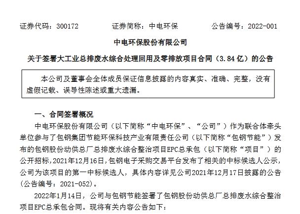 2022年1月14日,公司與包鋼節能簽署了包鋼股份動供總廠總排廢水綜合整治項目epc總承包合同。合同總額約3.84億元(含稅)。