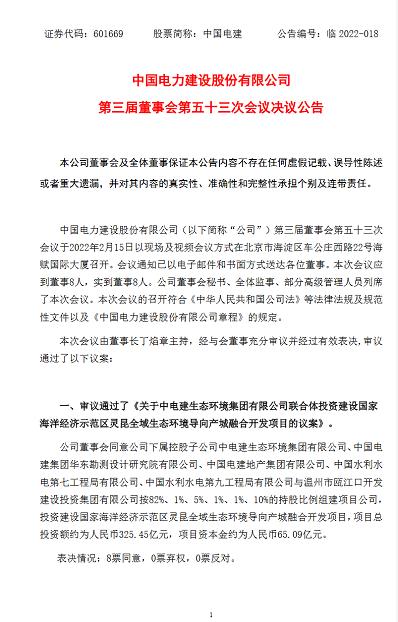 近日,中國電建發(fā)布公告稱,公司審議通過了《關(guān)于中電建生態(tài)環(huán)境集團(tuán)有限公司聯(lián)合體投資建設(shè)國家海洋經(jīng)濟(jì)示范區(qū)靈昆全域生態(tài)環(huán)境導(dǎo)向產(chǎn)城融合開發(fā)項目的議案》。