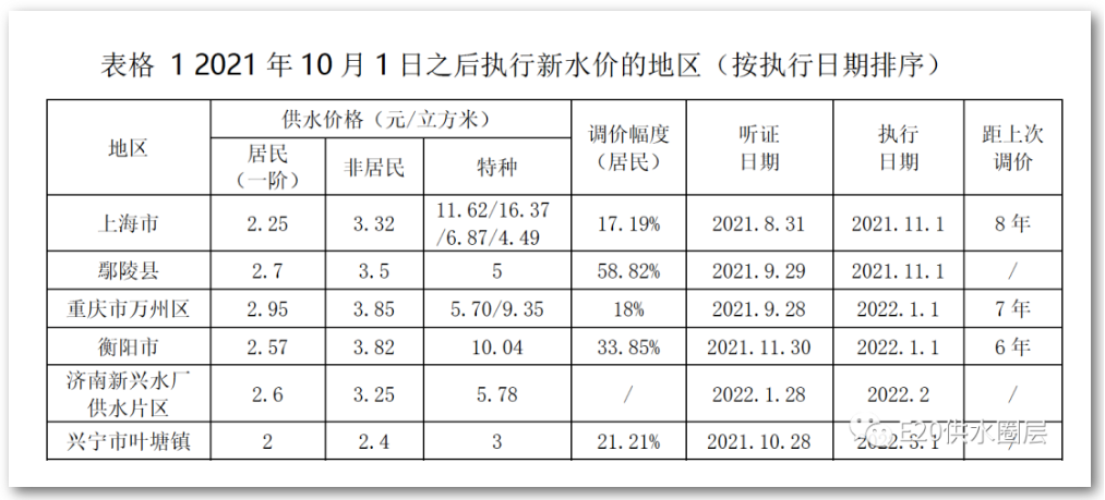 上海市、重慶市萬州區由于聽證時間早于2021年10月1日,所以價格制定仍按照舊版管理辦法執行,葉塘鎮雖然聽證會晚于10月1日,但是從其價格方案可看出仍按舊版規定設置價格水平,濟南鋼城區新興水廠片區本次調整目的為將片區水價與全區水平相統一。